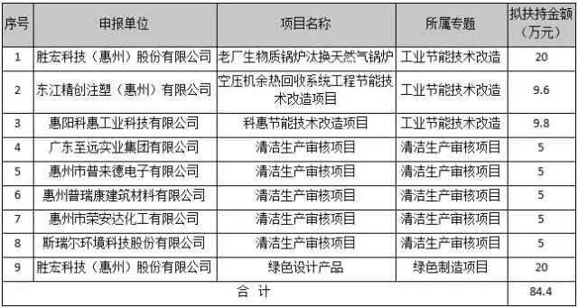 在奖励资金数额方面,开元体育科技凭借老厂生物质锅炉汰换天然气锅炉和绿色设计产品两项目共计获得40万元,东江精创注塑(惠州)有限公司和惠阳科惠工业科技有限公司则分别凭借各自的工业节能技术改造项目获得9.6万元和9.8万元奖励,惠州普瑞康建筑材料有限公司等5家企业的清洁生产审核项目均获得5万元嘉奖。